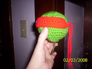 Here is the Pokemon crochet I started last night.......yep I only got the ball done of the tail............oh well..............I was tired and frustrated, so never picked it back up...........I think I will have it done today to surprise AJ with..................Chris will surely start bugging me too..........so I won't let AJ have his until Chris has some too..............Cruel aren't I??? LOL